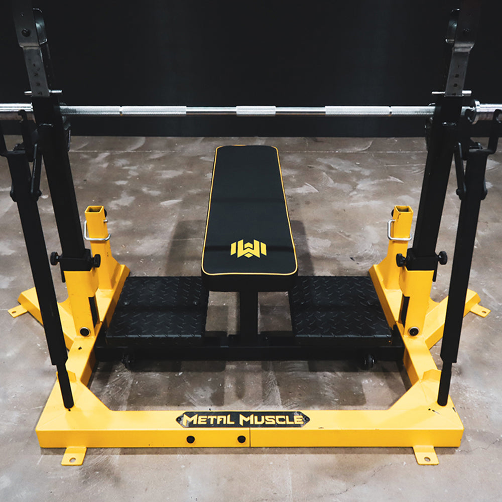 So what about the METAL MUSCLE Competition Combo Rack? You can call it the yellow Lamborghini of lifting racks! We’ve streamlined the look and cut the fat and added features that count to present a sleek upgrade on the standard boring grey design seen at most competitions. It’s the little details that matter and we made sure we kept all the functional parts and removed and improved anything that wasn’t. All measurements, sizes and details conform to IPF standards so this set up is suitable and ready to go for any level competitions and meets.